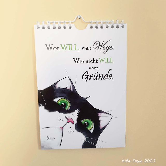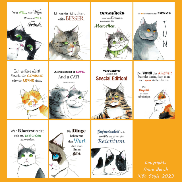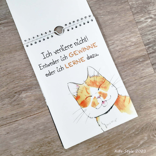 Ein Aufsteller im DIN A5-Hochformat mit 12 katzenhaften Weisheiten. Es ist KEIN Kalender, die Motive können daher beliebig gewechselt werden.